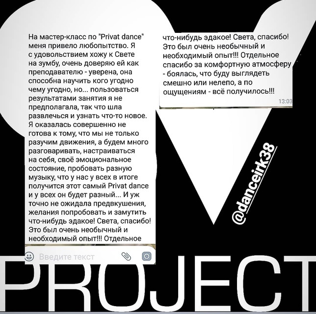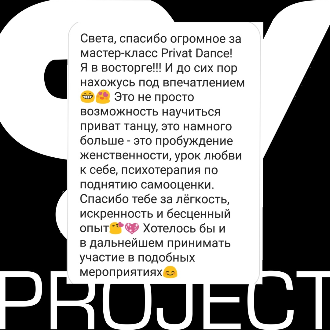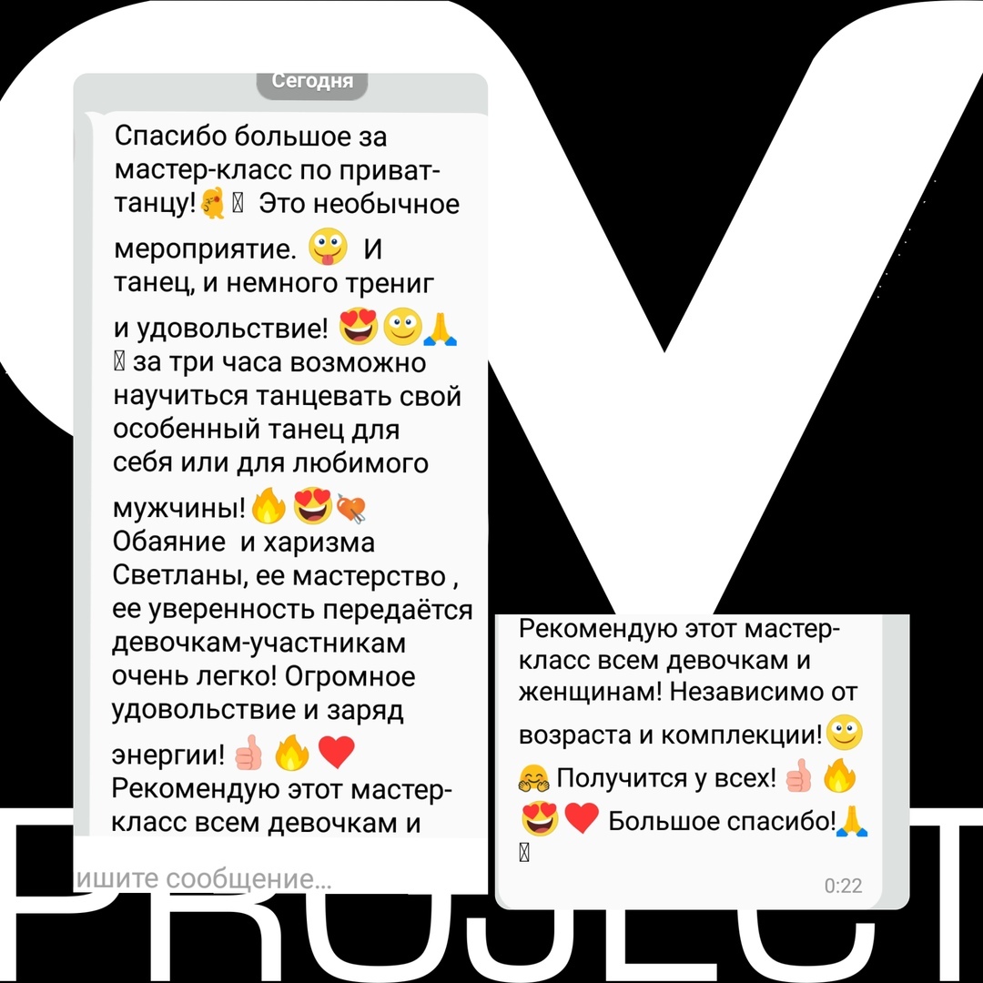 PRIVATE DANCE 2.0 за 3 часа Результат: готовый танец на 2-3 минуты на стуле Для кого тренинг? • для девушек +18 лет • кто был на Private Dance 1.0 • кто хочет развивать и совершенствовать свои навыки Программа: • Изучение танцевальных элементов на стуле. Постановка танца; • Искусство импровизации; • Разбор хореографических приемов, работа над пластикой; • Новые танцевальные элементы в partere * на полу; • Умение танцевать с предметом; • Работа над образом; • Типичные ошибки: как их не допускать. • Отличное настроение, положительные эмоции, новые ощущения себя.