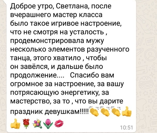 | PRIVATE DANCE 1.0 за 3 часа Результат: готовый приват-танец на 2-3 минуты Для кого тренинг? • для девушек +18 лет • кто хочет научиться танцевать приват-танец • кто хочет научиться по-новому чувствовать своё тело • удивить и порадовать себя и своего мужчину • кто хочет раскрепоститься, стать уверенней и танцевать от Души. Программа: • Изучение танцевальных элементов. Постановка танца. • Как выгодно преподнести достоинства фигуры и скрыть ее недостатки; • Разбор хореографических приемов, работа над пластикой; • Установление эмоциональной связи с партнером во время танца; • Создание атмосферы и выбор образа; • Типичные ошибки: как их не допускать. • Отличное настроение, положительные эмоции, новые ощущения себя.